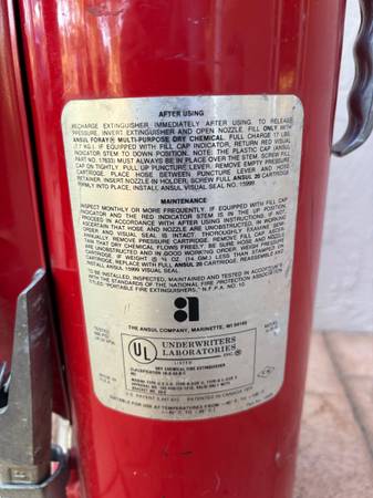 I am selling a VINTAGE ANSUL CARTRIDGE OPERATED DRY CHEMICAL FIRE EXTINGUISHER #1. This ANSUL fire extinguisher is in very nice condition for its age. It has the original cartridge mounted under the red cover plate as well as the original hose. I understand this model was made in 1970. It was tested 600 PSI. It is very heavy. I am selling it for $250.00