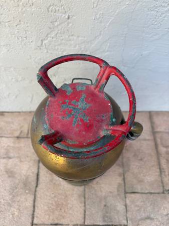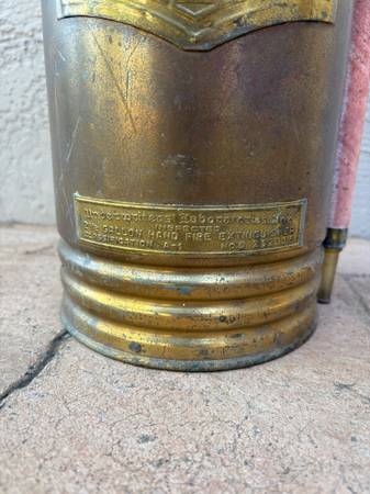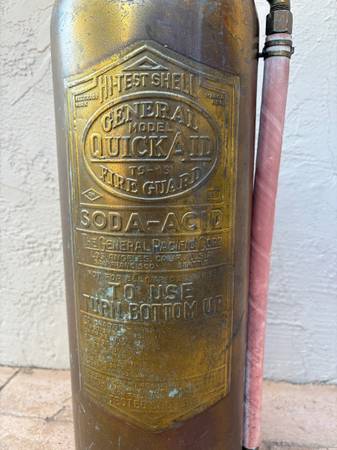 I am selling a VINTAGE GENERAL QUICK AID SODA-ACID BRASS FIRE EXTINGUISHER. This General brass fire extinguisher is in nice condition for its age. It has the original hose. It is 2 1/2 gallon and is class A-1 certified. The extinguisher has a rattle on the insider and one section on the red top rim is missing. I am selling it for $125.00