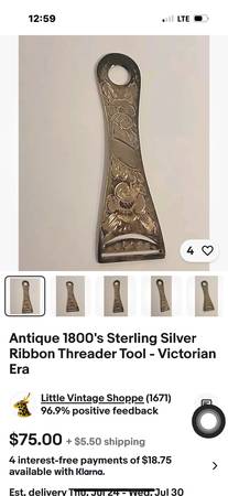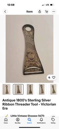 Antique Sterling Silver 1800's Ribbon Threader Tool - Victorian Era with engraved design. Measures about .75" long.
