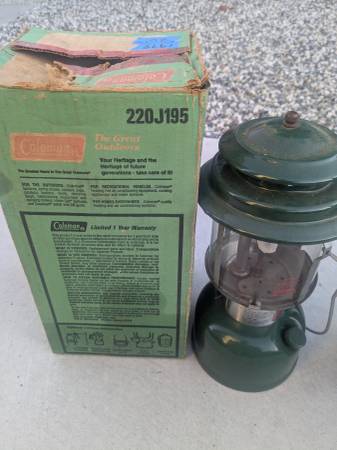 I have two older Coleman lanterns , one is 1979 and I am not sure of the other. the 1979 one comes with the box and is in very nice shape. the other has a broken globe. Twenty dollars for both....
