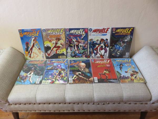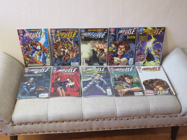 DC Impulse (1995-2002) Lot includes Impulse issues #1-25 and Dead Heat Tie In Saga in Flash #108-111, which includes first appearance of Savitar. Extras includes an additional copy of Impulse #2, #15, #18 (unopened in original sealed plastic cover and includes unopened special “on the edge”), and #23. Total in this lot is 33 comic books. Mark Waid story Humberto Ramos & Wayne Faucher cover & art.
