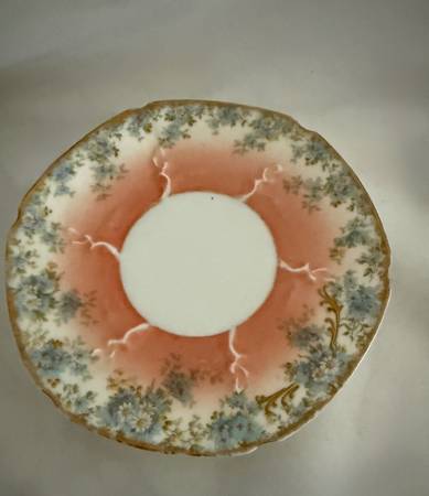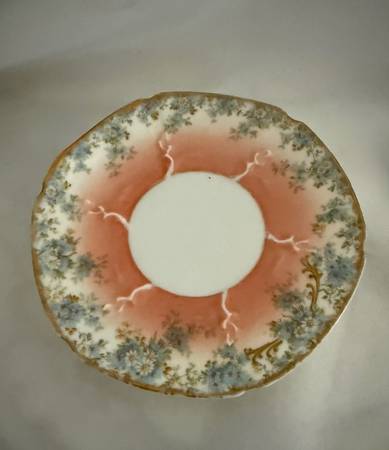 This is a beautiful saucer made of porcelain bone china, with a glossy finish and decorated in peach, green and white. The saucer is round and measures 5.5 inches in diameter. It is an original piece and was manufactured in the France. The saucer is perfect for all occasions, including birthdays, anniversaries, and holidays. It is also dishwasher safe and has platinum-plated features. The saucer is a vintage item, but its exact era is unknown.