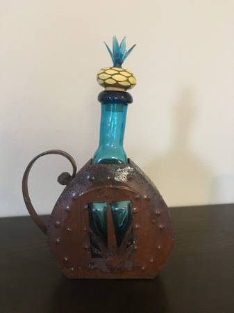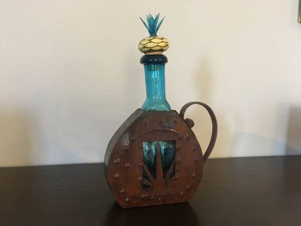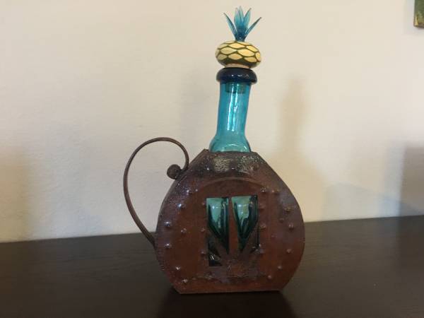This is a metal and glass tequila bottle. Rustic metal with glass that is actually hand blown inside the metal so it protrudes thru the metal . Hand created agave glass top. This is a great collectible and a decor piece for those who love tequla!! Very rare and a great find! Tequila not included.
