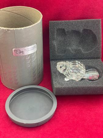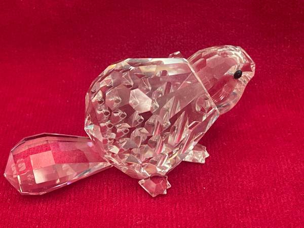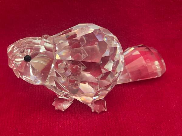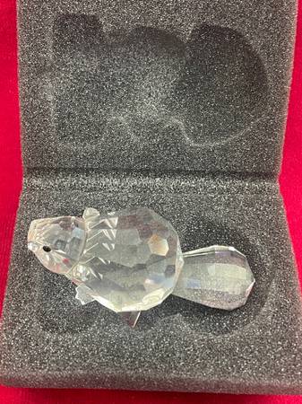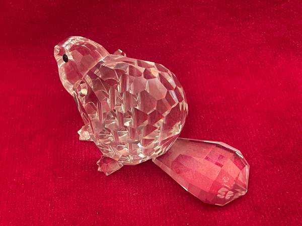 This is a Swarovski figurine of a sitting baby beaver, part of the Endangered Animals collection. It was manufactured between 1992-1999 in Austria and comes in its original box. The figurine is made of clear crystal and measures 1.25" in height and 1" in width. It features Adi Stocker's design and is an original piece. It is a small decorative item suitable for any room and is perfect for animal and dinosaur enthusiasts.