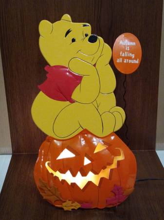 VINTAGE DISNEY WINNIE THE POOH FALL/HALLOWEEN LIGHTED INDOOR DECORATION, SIGN IS ALSO IN SPANISH ON THE OTHER SIDE MEASURES 17 1/2 INCHES TALL X 10 INCHES WIDE NEW IN BOX $25.00