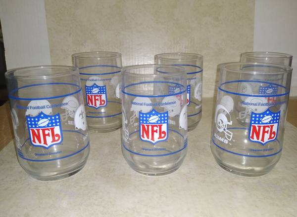 6 VINTAGE NFL NATIONAL FOOTBALL CONFERENCE WESTERN DIVISION 12 OZ GLASSES, GLASSES HAVE DIFFERENT TEAMS ON EACH GLASS THEY MEASURE 4 3/4" X 2 3/4" ASKING $ 30.00 FOR ALL 6 (FIRM)