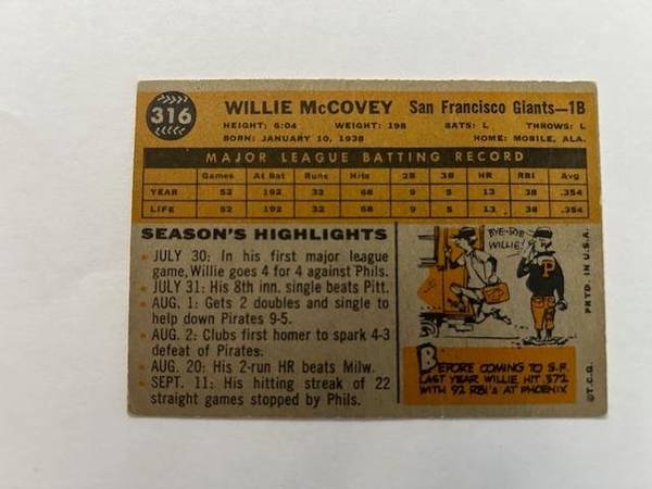 1960 Topps #316 Willie McCovey Rookie Card San Francisco Giants VG-EX Condition is Ungraded. $80.00 CASH ONLY!!!