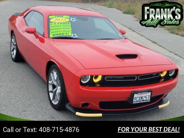 2023 *Dodge*Challenger*GT -Stock 12183 Frank's Auto Sales 408-715-4876 - Call now for your best deal! ๐ ๐ Why Shop With Us? Located in Salinas, California, Frank's Auto Sales, INC. is a pre-owned, late model dealer that provides customers with a complete automotive experience at competitive prices. Frank's Auto Sales, INC. is dedicated to customer satisfaction and we have provided you with a map, as well as our address and phone number to help you find us easily. We are passionate about luxury cars and we intent on sharing that passion with you when you purchase your new car from us. Come by today and test drive the car of your choice. Year: 2023 Make: Dodge Model: Challenger Trim: GT Mileage: 51k miles Exterior Color: Torred Clearcoat Interior Color: Black Engine: 3.6L 6 Cylinders Drive: rwd Transmission: Automatic VIN: 2C3CDZJG0PH503636 Our dynamic One Owner 2023 Dodge Challenger GT Coupe offers a well-executed design in TorRed! Powered by a 3.6 Liter Pentastar V6 that provides 303hp to an 8 Speed TorqueFlite Automatic transmission for quick gear changes with acceleration to match.This Rear Wheel Drive muscle car is an all-around athlete with performance-enhanced braking, suspension, and steering systems, and it returns nearly 30mpg on the highway.As for enhanced style, our Challenger has a functional hood scoop, an SRT front splitter, LED taillights, dual bright-tipped exhaust outlets, a black rear spoiler, and 20-inch Satin Carbon wheels with Rhombi center caps. Settle inside our GT cockpit that greets you with classic hounds-tooth cloth seats with eight-way power for the driver, a leather-wrapped steering wheel, dual-zone automatic climate control, cruise control, remote start, keyless entry, and pushbutton ignition.You can also tune into an ear-catching Alpine audio and connect on the go with a 7-inch touchscreen, Android Autoยฎ, Apple CarPlayยฎ, Bluetoothยฎ, and voice command. For peace of mind, Dodge provides a rearview camera, electronic stability/traction control, tire-pressure monitoring, ABS, hill start assistance, advanced airbags, and other rewarding safety features.A joy to drive, our Challenger GT is just waiting for you! Save this Page and Call for Availability.We Know You Will Enjoy Your Test Drive Towards Ownership!