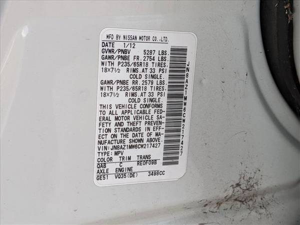 * Dual Moonroof * [L92] Front/Rear Carpeted Floor Mats & Cargo Area Mat * [B10] Splash Guards * Keyless Start * [C03] 50 State Emissions * Beige; Seat Trim * Glacier PearlThis vehicle includes a Money-Back Guarantee* and passed our precise inspection process. Best of all the price you see is the price you pay. No haggling. No back and forth. No pressure. And this price is so good it is guaranteed. *Money-Back Guarantee is valid for 5 days or 250 miles, whichever comes first. Subject to certain terms and conditions. See store for details. Some restrictions apply.Thank you for your interest in one of Mercedes-Benz of Stevens Creek's online offerings. Please continue for more information regarding this 2012 Nissan Murano SV with 82,822mi. This Nissan includes: [L92] FRONT/REAR CARPETED FLOOR MATS Floor Mats [B10] SPLASH GUARDS GLACIER PEARL *Note - For third party subscriptions or services, please contact the dealer for more information.* In their original incarnation, SUVs were chiefly owned by folks who valued utility above sport. Not anymore! The Nissan Murano SV redefines the SUV and makes the perfect all around family companion. Enjoy the grip and control of AWD performance in this nicely equipped Nissan Murano SV. In addition to being well-cared for, this Nissan Murano has very low mileage making it a rare find. More information about the 2012 Nissan Murano: Nissan's Murano stands out as offering one of the most stylish, best-trimmed, and best-appointed interiors from a non-luxury brand, with warm, soft-touch materials and color choices than make some other mainstream-brand crossover models seem drab. The Murano's powertrain, while not overtly sporty, is one of the smoothest and strongest in the segment--great for getting ahead at stoplights and making safe, quick passes on the highway. Ride quality is pretty impressive, especially with the standard 18-inch wheels-- it feels comfortable without being too floaty. This equates to confident handling without fatigue on longer drives. Strengths of this model include warm, luxuriously trimmed cabin, one-of-a-kind CrossCabriolet model, versatile interior layout, Strong, torquey engine and smooth CVT, excellent ride quality, and stylish exterior