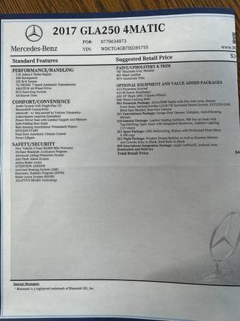 I bought this new in 2017 - a compact MB hatchback was very appealing to me. And I wanted something that looked really good both inside and out. I didn't really like the regular GLA250 seats, and once I learned of the Interior Package with Sport Seats I had to have it. Same with the Night and Premium Packages. Finally, I wanted AMG wheels. I got all this - and more - in this nifty ride. Check out the Sticker photo for details.