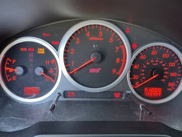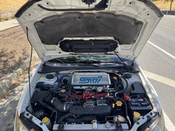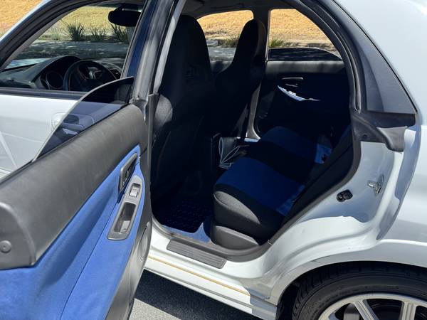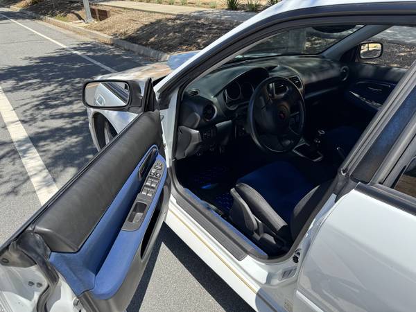 - Interior: OEM Blue STI Alcantara sport seats, OEM STI gauge cluster, OEM sporty trim