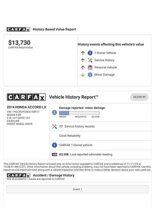 2014 Honda Accord LX Sedan 88k miles(may increase a bit as still driving).