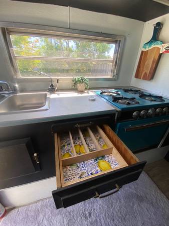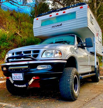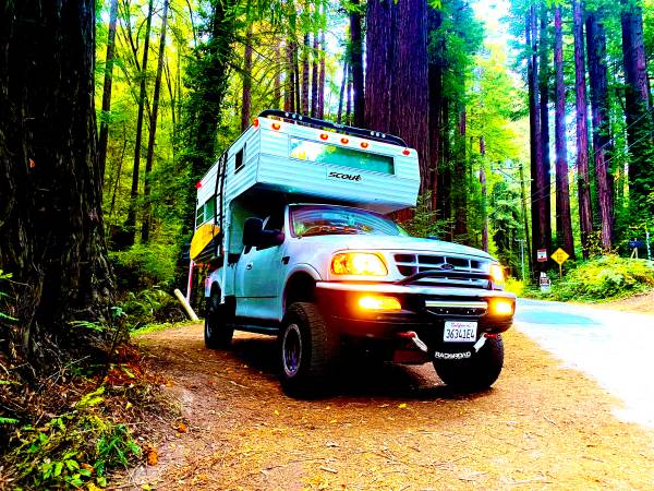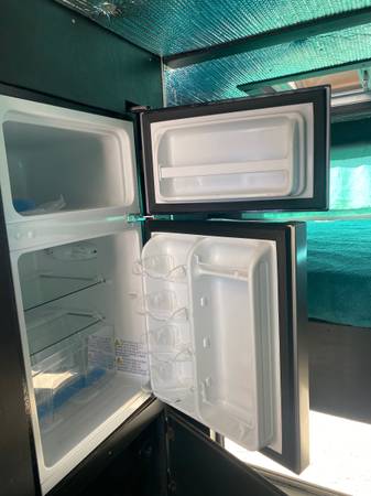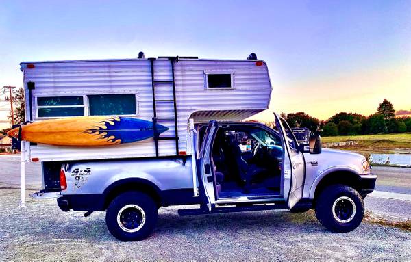 CAMPER HAS BEEN RESTORED AND THERMAL INSULATED, LARGE COZY BED OVER CAB, KITCHEN WITH LARGE NEW FRIDGE /FREEZER, 4 BURNER STOVE AND FULL SIZE OVEN (PROPANE), DOUBLE SINK, SOLAR OUT DOOR SHOWER, PORTABLE BATHROOM, LOTS OF STORAGE.