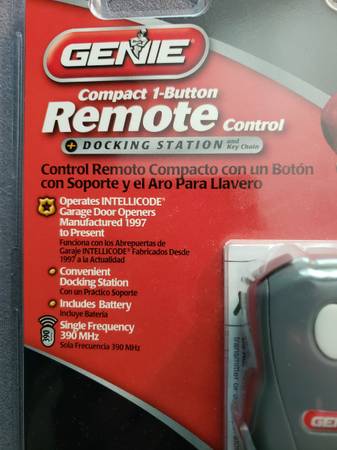 Genie Compact 1 Button Garage Door Remote Control with Docking Station and Key Chain. New In Box, Never Used. Call or text me at if interested.