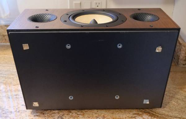 This is a two-way vented-box system, composed of a single 1" alloy dome cone tweeter and a single 6.5" woven-kevlar cone woofer. It's an extremely large center-channel speaker, measuring 17.7" wide, 11.4" deep, and 12.1" tall. It's also extremely heavy, weighing nearly 30 pounds. It has two sets of speaker cable binding posts to allow bi-wiring. The speaker is constructed of genuine walnut wood and the grain on the wood is beautiful.