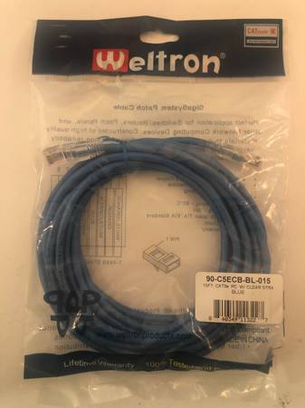 This is a new 15-foot blue ethernet cable Cat. 5e NEW (1 each) Cat. 5e Network Cable, RJ45 Male/Male, 15 ft Blue NEW Qty available = 3 Call or text for a prompt reply for a local pickup appointment....