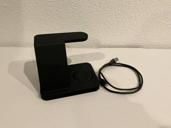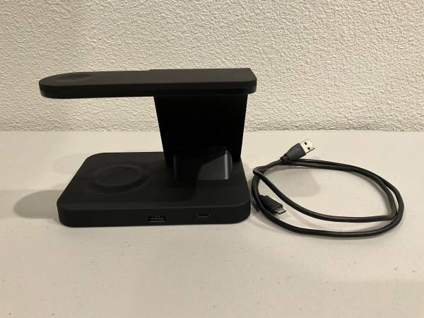 Wireless charging stand for phone, airpods, apple watch and an extra usb port for a 4th charging option.