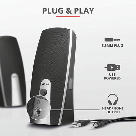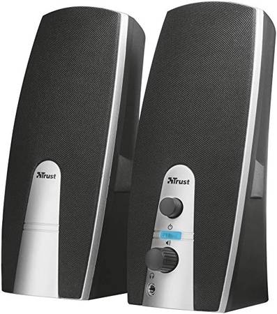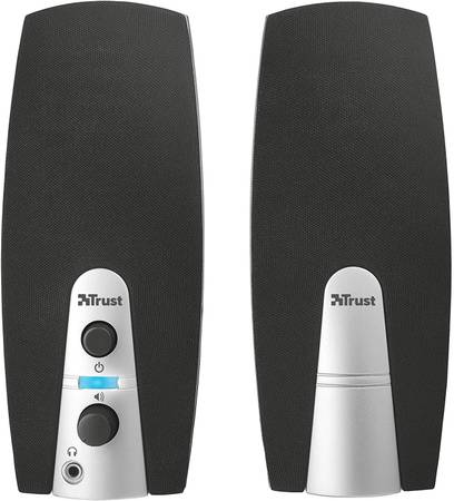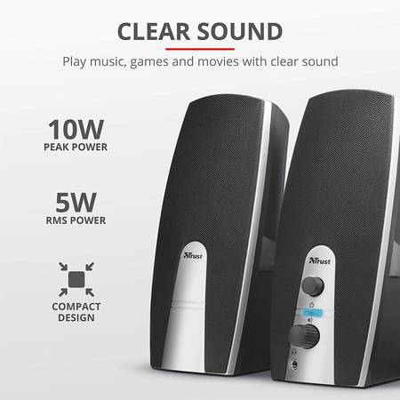 Speakers Set 5W Black, Silver Loudspeaker, Trust Mila 2.0 Compact stereo speaker set with 5 Watt RMS output (10 Watt peak power) Power output (peak): 10 W Power output (RMS): 5 W Cable length audio...