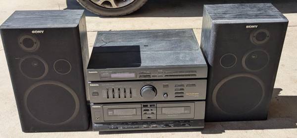 Vintage Panasonic SA-H90 Hi-Fi Audio System. Comes with an AM/FM stereo tuner, stereo control amplifier, and stereo double cassette deck. Comes with a pair of Sony SS-D115 3-way bookshelf speakers.