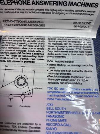 TDK cassettes telephone pack (2 ps) TDK -D60L & TDK endless cassette es-30sg new in double factory packaging in excellent condition. **NO RETURN ---------------------------------------------...