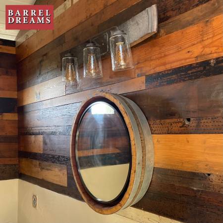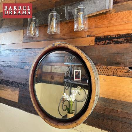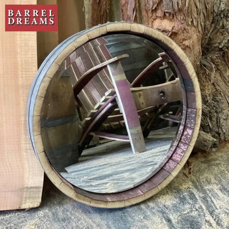 We have created this mirror framed with the original metal bands and the natural red coloring earned from years of wine production. The inside of the barrel surrounding the mirror displays lots of the wine coloring. Yes you will look better in a wine barrel mirror! Special Note: Because each barrel has its own unique characteristics no two items are exact same.