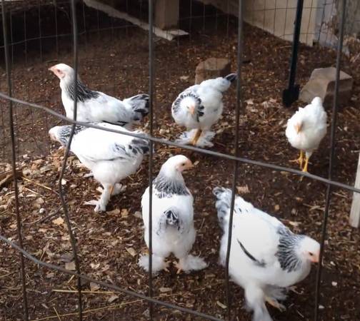 Light Brahma chickens make ideal pets, as they are very quiet, gentle and easy to handle. It is one of the most gentle breeds of chickens. They are all white with black tail and neck feathers, they also have feathers on their feet. Their docile, gentle, and quiet temperament makes them one of the best breeds around children. Hens lay about 200 medium-sized brown eggs annually, sometimes go broody, and are attentive mothers.