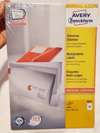 Avery Zweckform 3651 Universal Labels 52.5 x 29.7 mm 100 Sheets White 4,000 label Brand New. Never opened. Manufacturer Avery Dennsion Zweckform Brand AVERY Zweckform Item Weight 3.52 ounces...