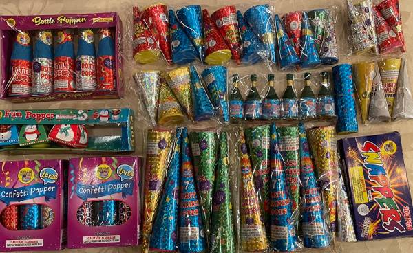 Set of 60 confetti party poppers. Various types: cone type, barrel type, box type, champagne bottle type. All ready to give some excitement to your birthday or holiday party. All for $4.