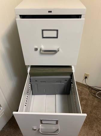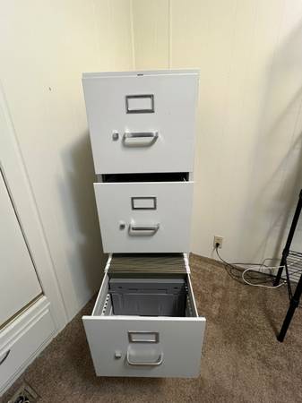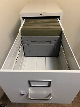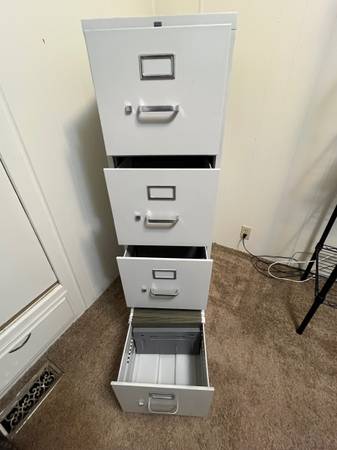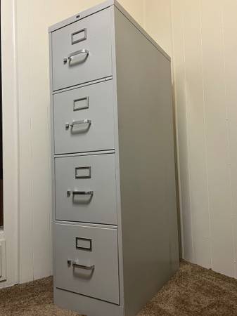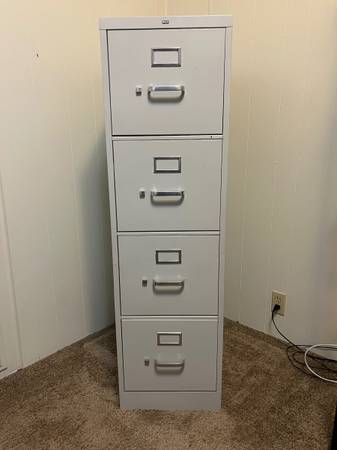 For sale: One Heavy-Duty, High-Quality HON 4-Drawer Letter-Size File Cabinet in Light Gray. This cabinet measures 51" high, 15" wide, and 26.5" deep. All four drawers are in excellent working condition and glide smoothly on their rails.