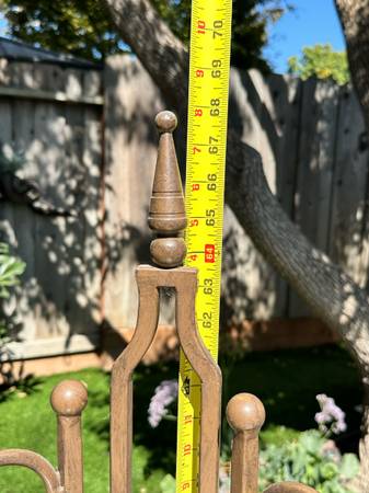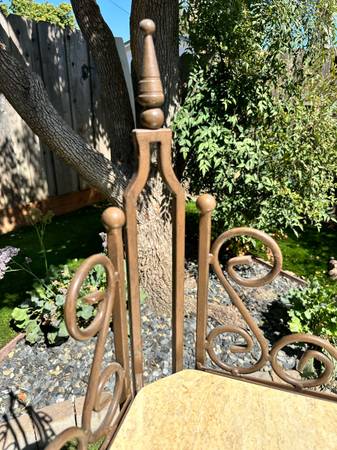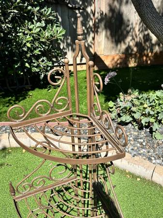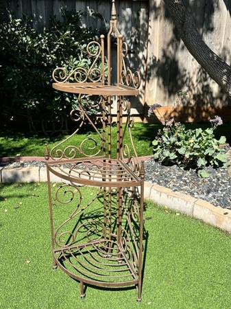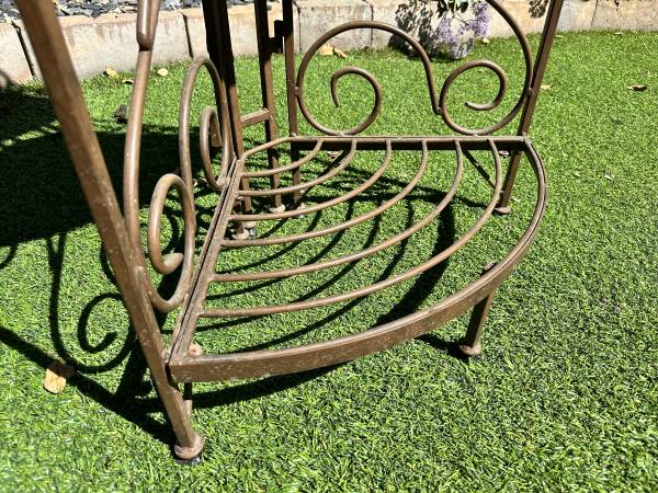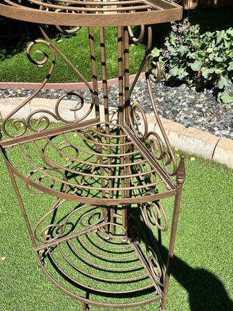 Corner scroll work unit is made of metal and/or cast iron. It has adjustable rubber feet. Top 2 shelves have removable marble shelves. No chips or cracks. It has a brown finish that looks baked on....
