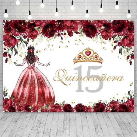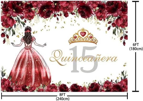 NEW 8ft x 6ft Quinceanera 15th Birthday Backdrop Girls Mexico Photography Background Burgundy Red Flowers Golden Crown Party Banner Photo Booth