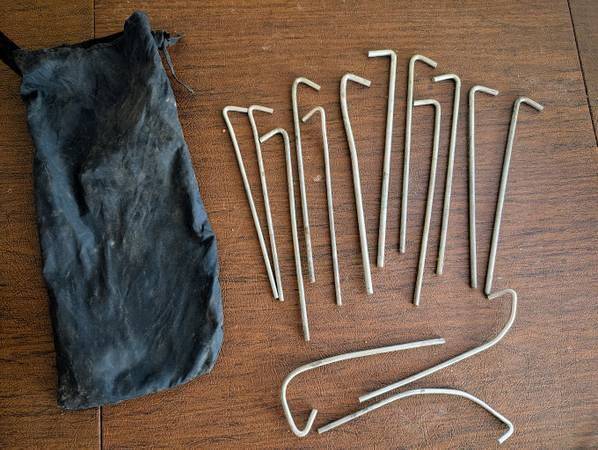 lot of 15 7" camping tent stakes metal steel pins with hooks. some are bent. All usable. With a beat-up carrying case. $4