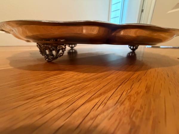 Elegant silver plated tray with intricate design, measures 17.5” across.