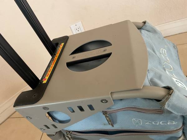 Light blue- shows some wear but plenty of life left. Wheels move great, so do all the zippers, and the handle. I wiped it down but you can still see some dirt stains.