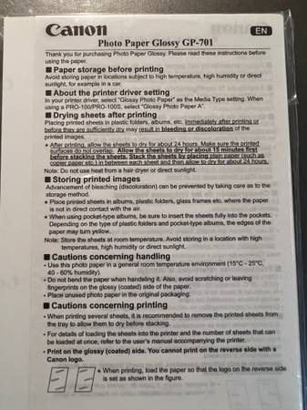 Canon Glossy Photo Paper - GP-701 - 4x6 (50 Sheets) - 3 pack. Total 100 sheets Please see pictures for details.