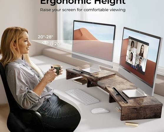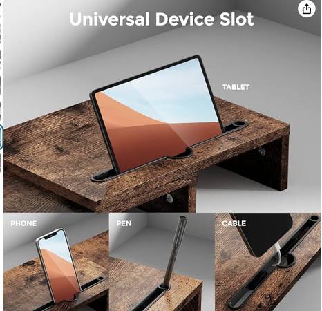Monitor Stand With 2 Slots For Phone & Tablet. Dual Monitor Riser-New 2 available. One is the box, have not assembled. One is assembled (for pictures taken) Color Vintage Material Engineered...