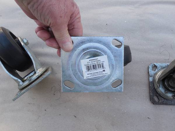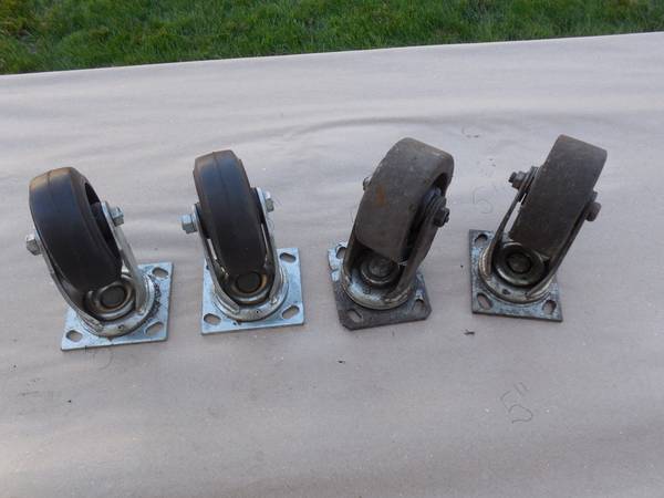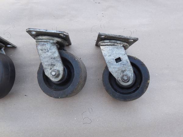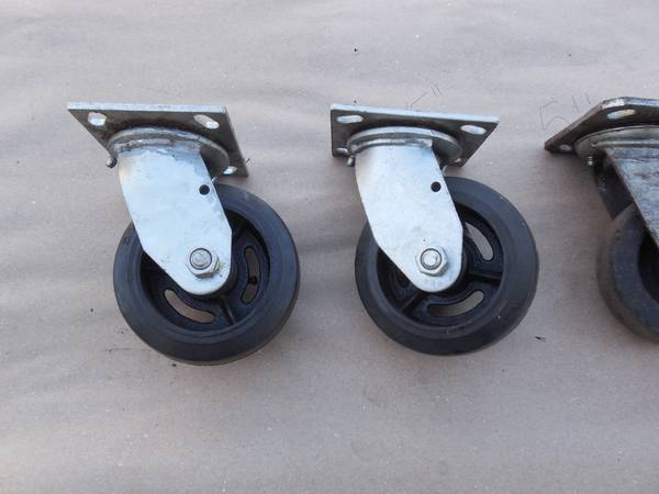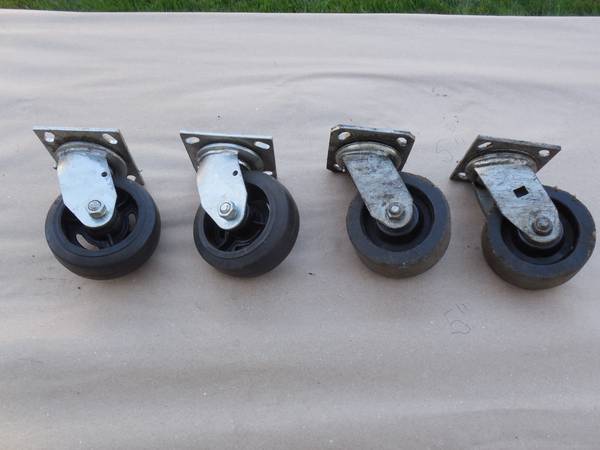 LARGE HEAVY DUTY 5" CASTERS. 2 NEW. 2 USED. PROBABLY GOOD TO 2000 + LBS. THANK YOU FOR LOOKING. DAVID IN SUNNYVALE.