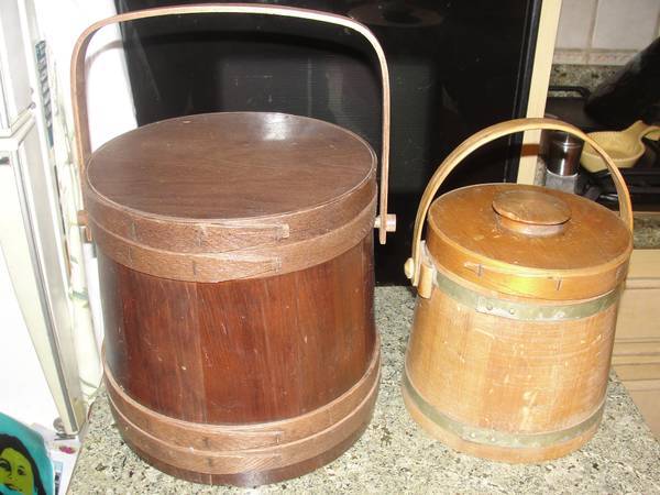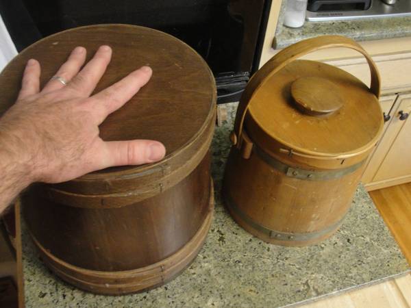 2 FIRKIN sugar bucket old antique wood pail w lid (sunnyvale)