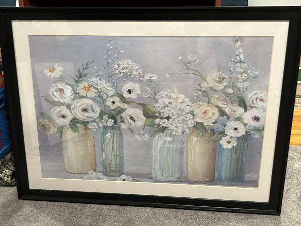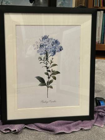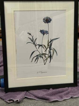 Three framed flower print wall art: 1. Blooming Meadow Beauties: 36"x26" 2. Cornflower: 16"x19" 3. Blue Plumbago: 16"x19" Black Frames.