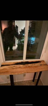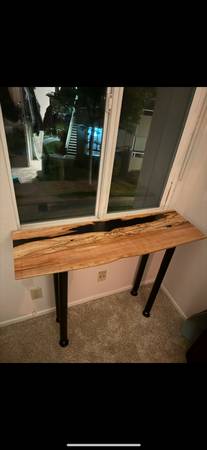 Tigertail Spruce with 7 black epoxy fills 41”W x 13”D. 30-33” adjustable height