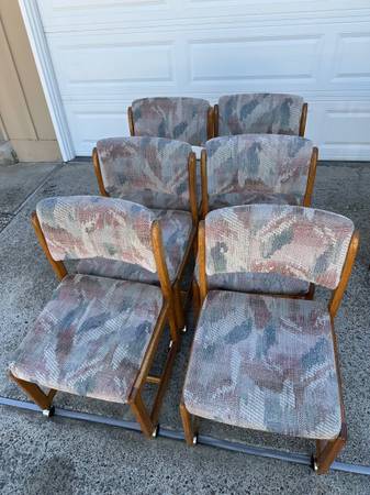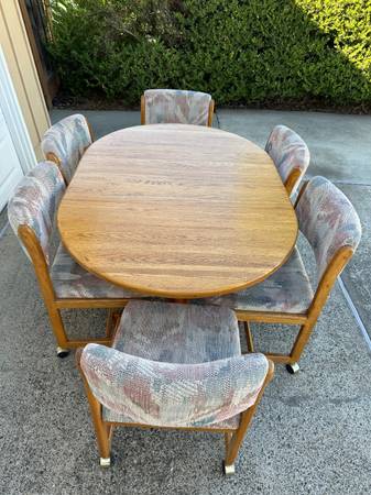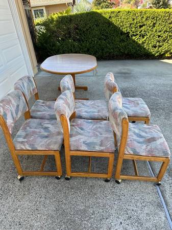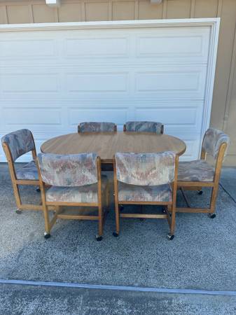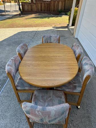 *Oak kitchen table in great condition *6 cushioned chairs with wheels (Chairs and fabric in good condition, padding slightly compressed)