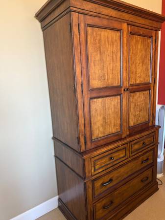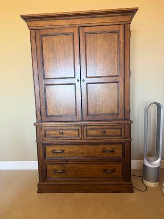 This armoire works beautifully as a bedroom wardrobe, linen cabinet, or media cabinet. Its timeless design complements traditional, rustic, and transitional interiors.
