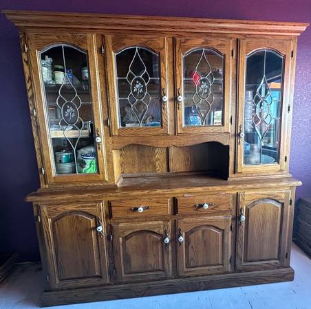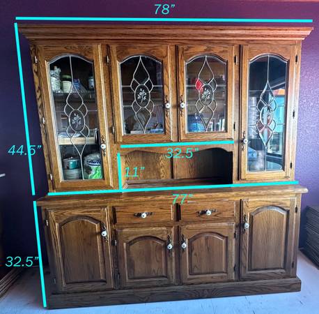 Kitchen Hutch Cabinet - solid oak Excellent condition with lots of storage and beautiful glass work. Overall dimensions: 78" (L) x "(H) x 18"(D) Two pieces: top 44.5" (H) and bottom 32.5" (H)