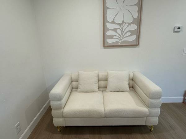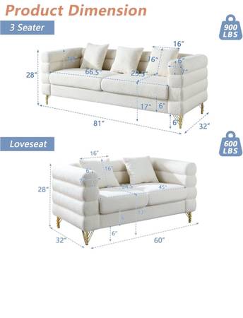 Beautiful modern set . I bought it for $950 and it is like new. Asking $580 Loveseat: 32’’L*60’’W*28’’H. Weight Capacity: 600lbs. 3-seater Sofa: 32’’L*81.5’’W*28’’H. Weight Capacity: 900lbs.