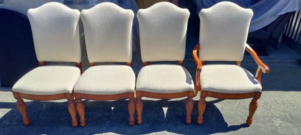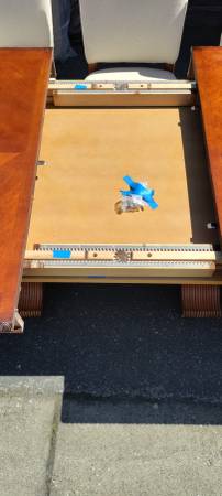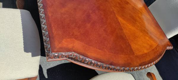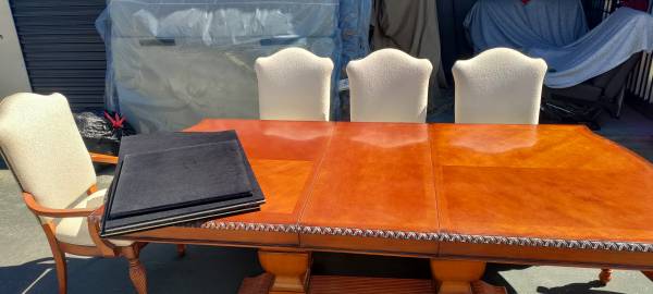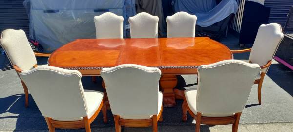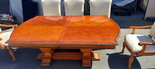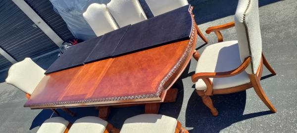 I have a beautiful hickory white dining room table, in mint condition. Solid wood very sturdy all the chairs are in good condition. they are sturdy like new, no rips or stains. as you can see in pics there is a cover for the top of the table. Two armchairs and six side chairs. dimensions with the leaf 46"x96" and without leaf its 76". do your research this is a very expensive table. i also added a pic of the mechanical gear that opens and closes for the leaf extension.also all chair are solid like new. No squeaks or cracking or rocking. Make me a reasonable offer I just might except it.
