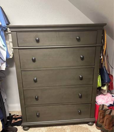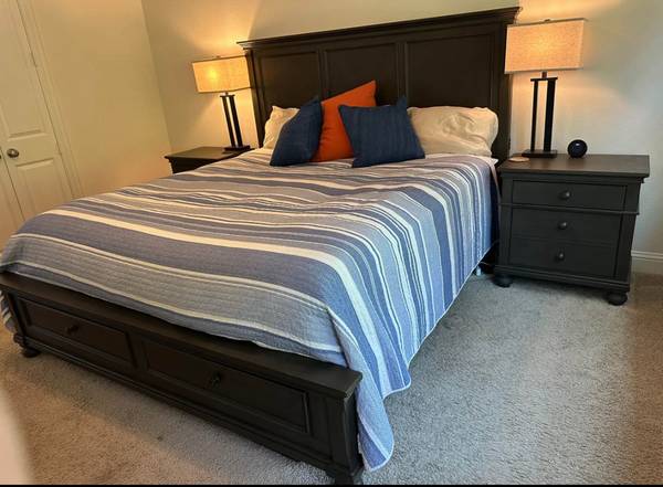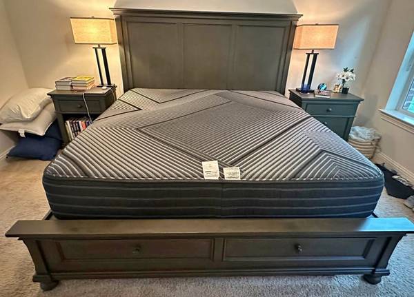 Only 1 year old in excellent condition. Mattress is in excellent condition too. 2 night stands, 8 drawer tall dresser (top left side for jewelry) with mirror & TV bracket (attaches to back if you want to use mirror elsewhere), 5 drawer dresser with pull out wooden rods on each side - will throw in lamps when purchasing everything!