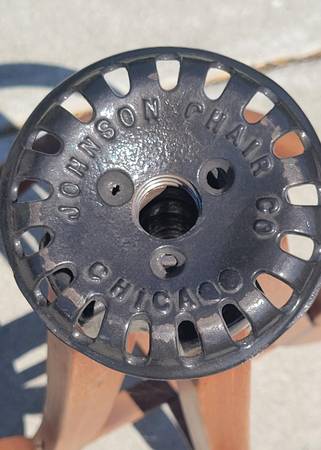 A swivel draftsman or architect stool from around 1900 is solid quarter sawn oak with an excellent finish. The original cast iron swivel mechanism is embossed "Johnson Chair Co. Chicago," and has a locking height adjustment.