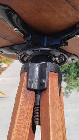 This rugged and heavy antique office furniture has a round ring footrest and sculpted seat. Size is 19" across the base and height adjusts from about 30-34" overall.