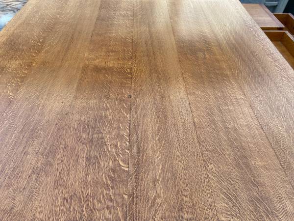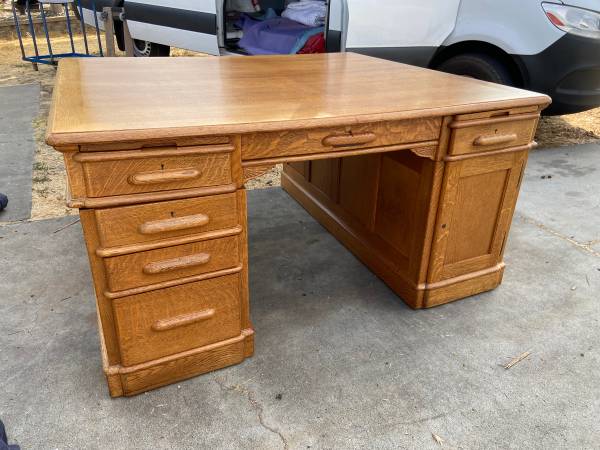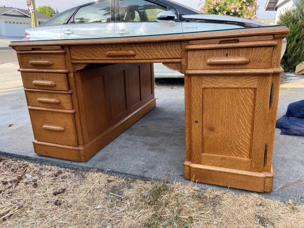 This antique oak partners desk with a glass top is a stunning piece of furniture that exudes craftsmanship and timeless style. The desk features intricate carvings, more than 5 drawers, and a unique arts & crafts/mission design. Crafted from solid oak, with a beautiful oak finish, this desk is not only functional but also a decorative piece that adds character to any room. The inclusion of a glass top adds a modern touch to this classic and traditional desk, making it a versatile addition to any home or office space.