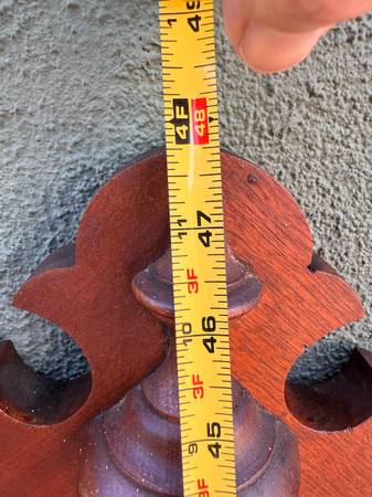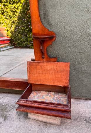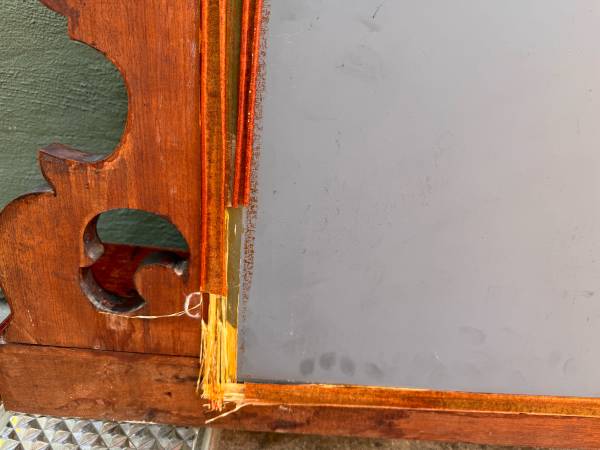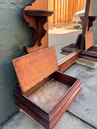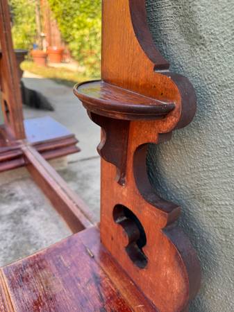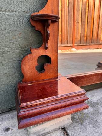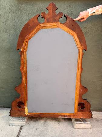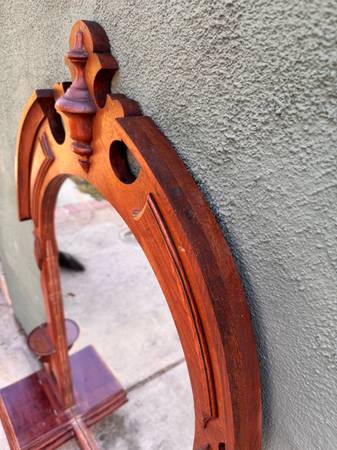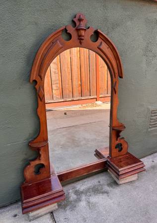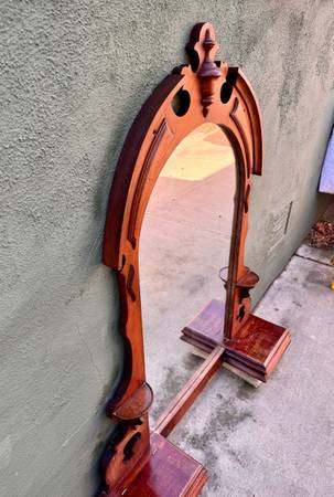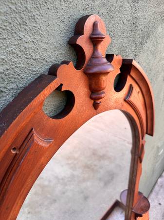 This Eastlake mirror piece was originally part of a low dresser was used as a bathroom mirror attached to the wall above the sink. Since the bathroom was remodeled arched mirror was stored away indoors for several years. Walnut could use some TLC. Mirror needs resetting within the frame currently held in place by strong tape but has become brittle with time. Not terribly heavy to move.